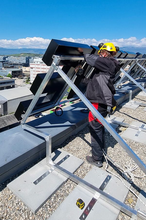 Pose d’enseignes lumineuses à Plan-les-Ouates. Pose et fixation des 11 éléments sur le châssis réalisé par le client. Réalisation de l’ensemble des câblages électrique et les boites de dérivations. Fixation des transformateurs au raccordement du réseau électrique à 220V.